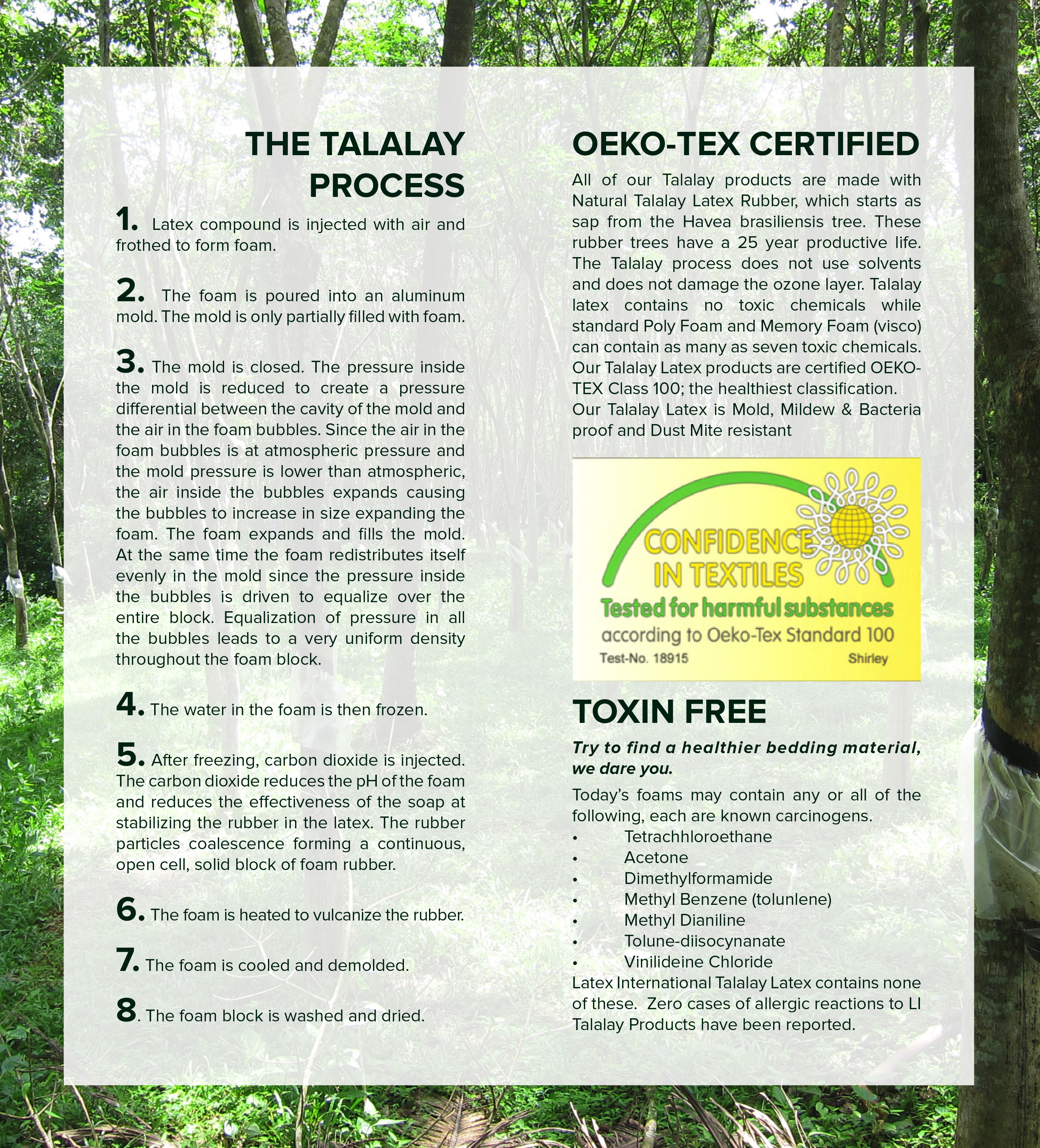 HOW IS TALALAY LATEX ENVIRONMENTALLY FRIENDLY? The manufacturing process does not use solvents and does not damage the ozone layer. Talalay Global’s Talalay latex is certified by Oeko-Tex (Europe’s highest environmental consumer product standard) to be free of harmful substances or chemicals.