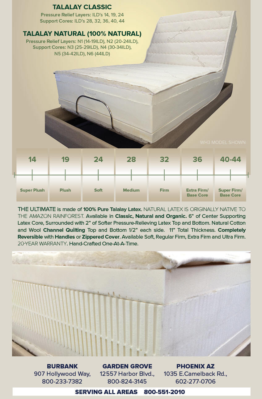 Talalay latex rubber is “bottomless.” Even when you lay on your side, your body does not “bottom out” into a hard layer in the mattress or on the foundation. Memory foam allows you to bottom out onto what is underneath it.
