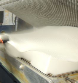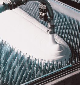 The batter is transferred to the pressroom where it is whipped into a froth and injected into an aluminum pincore mold. The pins create the unique aerated cell structure of our latex. The mold is sealed and a vacuum is pulled to extract air and completely fill the mold cavity with foam. |